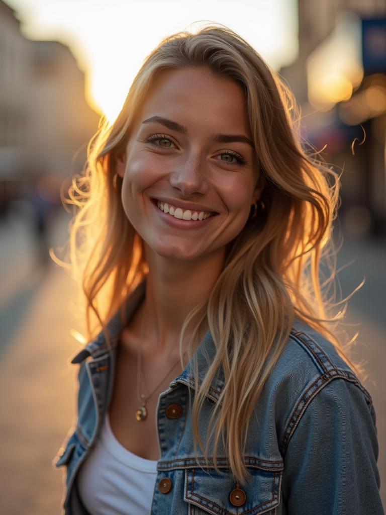 headshot of smiling model wearing casual clothes posing for dating app headshot. outdoor blurry background. the lighting is warm, possibly from a setting sun, creating a soft glow around him, enhancing the casual and relaxed vibe of the image. the setting seems to be outdoors, likely in an urban environment, with the blurred background hinting at a street or park-like area. this image likely portrays a youthful, active, and approachable individual, possibly in a lifestyle or fashion-related context.