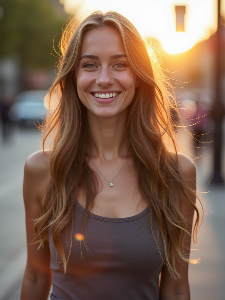 headshot of smiling model wearing casual clothes posing for dating app headshot. outdoor blurry background. the lighting is warm, possibly from a setting sun, creating a soft glow around him, enhancing the casual and relaxed vibe of the image. the setting seems to be outdoors, likely in an urban environment, with the blurred background hinting at a street or park-like area. this image likely portrays a youthful, active, and approachable individual, possibly in a lifestyle or fashion-related context.