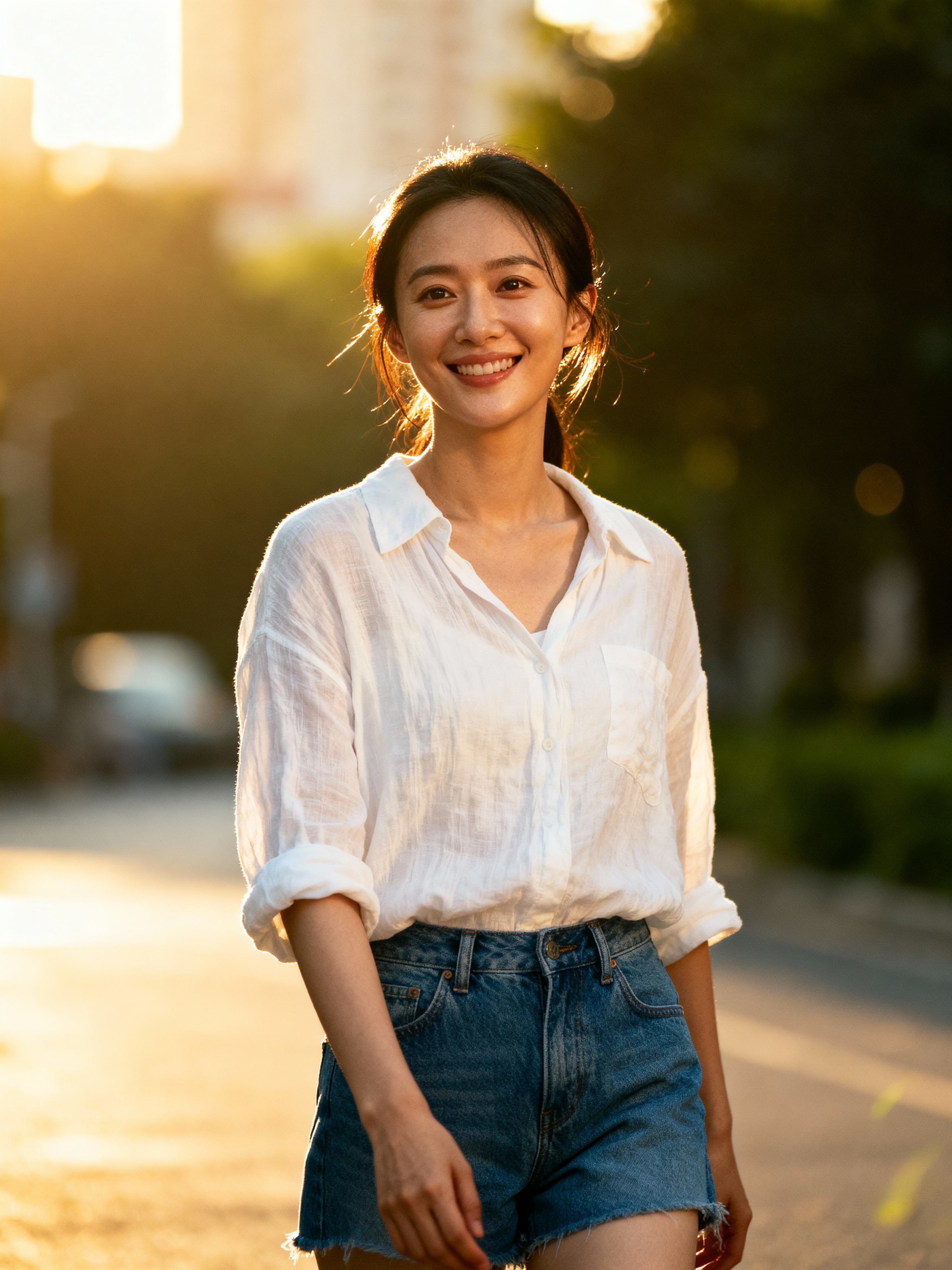 headshot of smiling model wearing casual clothes posing for dating app headshot. outdoor blurry background. the lighting is warm, possibly from a setting sun, creating a soft glow around him, enhancing the casual and relaxed vibe of the image. the setting seems to be outdoors, likely in an urban environment, with the blurred background hinting at a street or park-like area. this image likely portrays a youthful, active, and approachable individual, possibly in a lifestyle or fashion-related context.