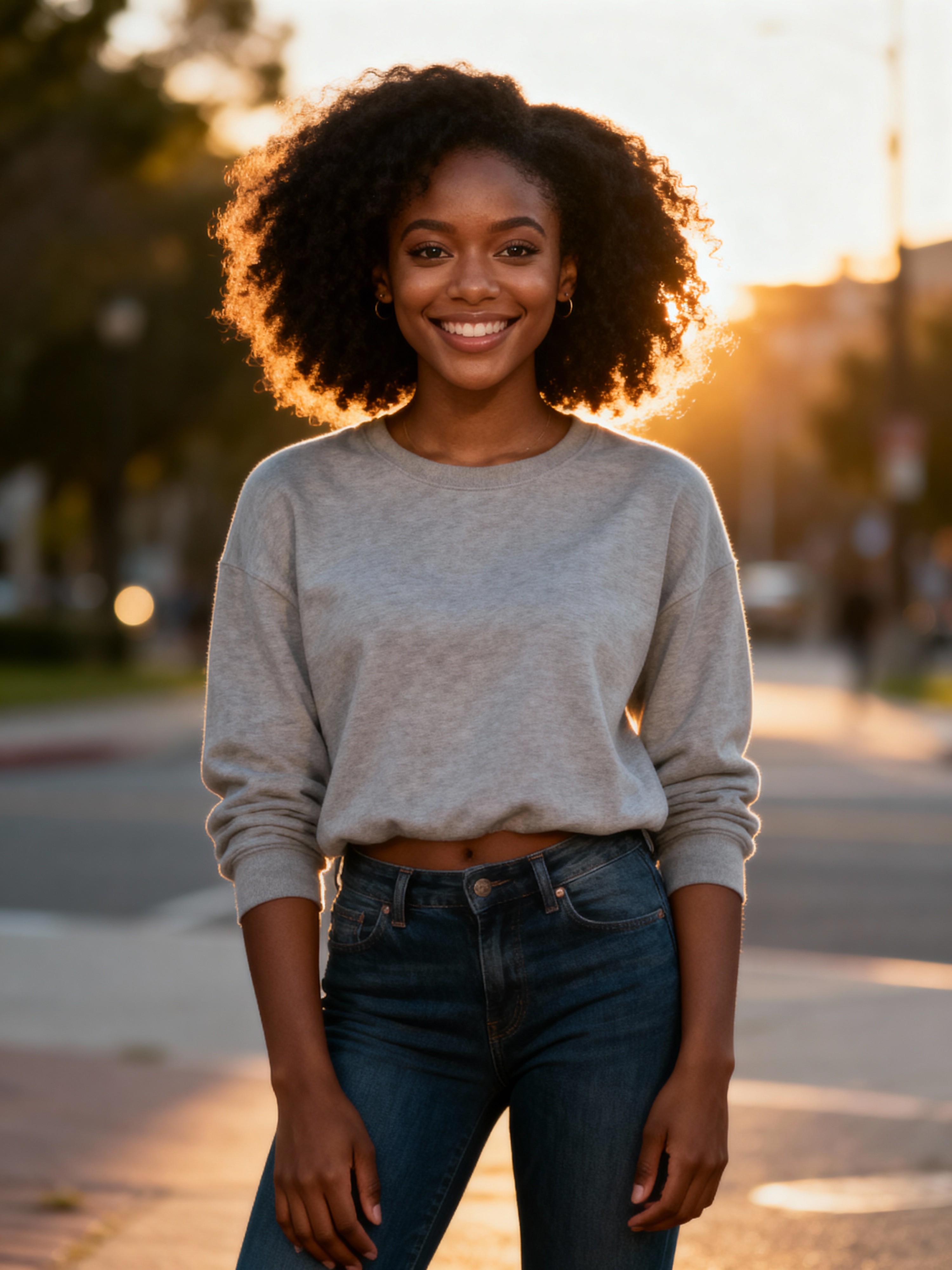 headshot of smiling model wearing casual clothes posing for dating app headshot. outdoor blurry background. the lighting is warm, possibly from a setting sun, creating a soft glow around him, enhancing the casual and relaxed vibe of the image. the setting seems to be outdoors, likely in an urban environment, with the blurred background hinting at a street or park-like area. this image likely portrays a youthful, active, and approachable individual, possibly in a lifestyle or fashion-related context.