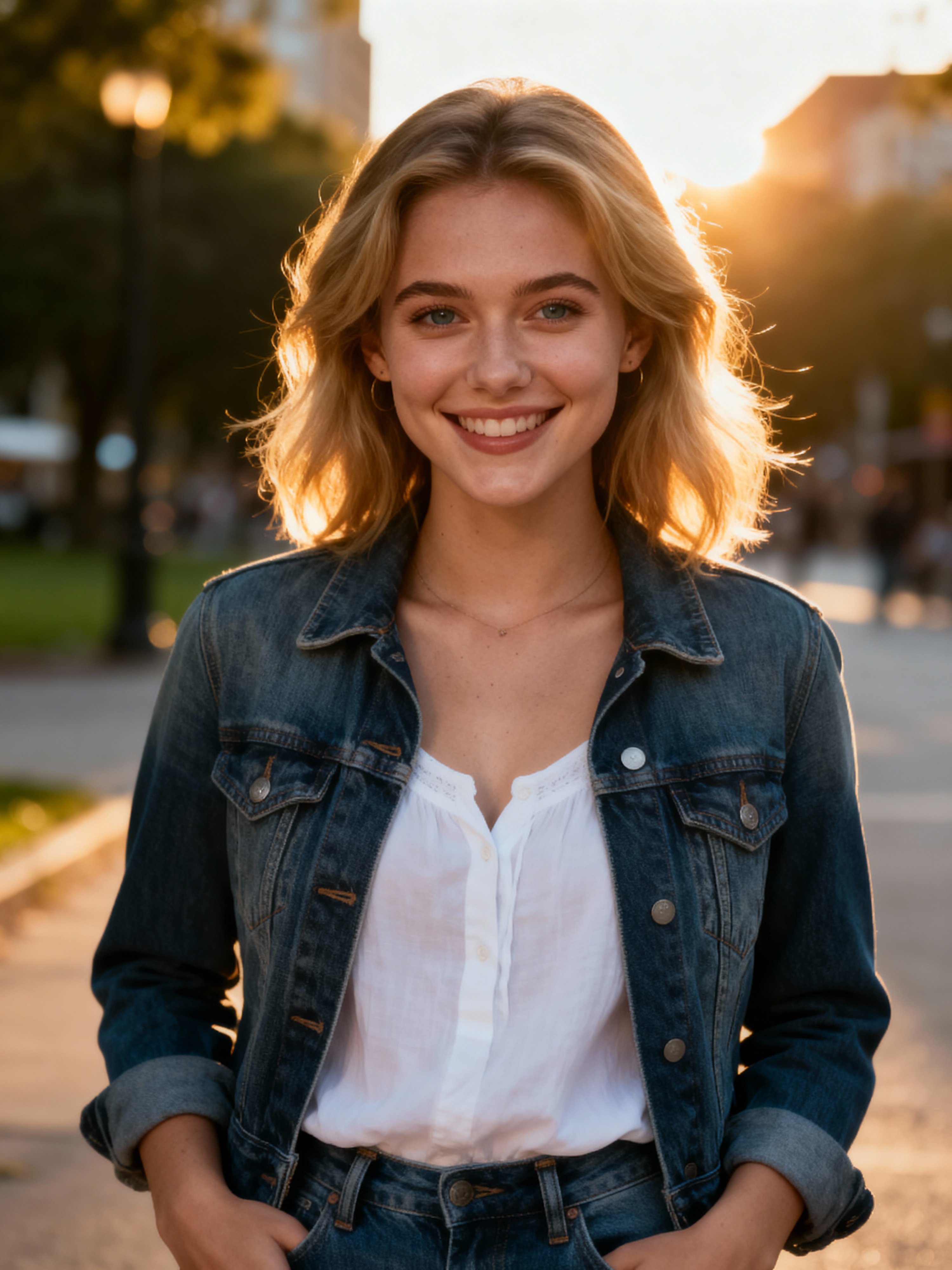 headshot of smiling model wearing casual clothes posing for dating app headshot. outdoor blurry background. the lighting is warm, possibly from a setting sun, creating a soft glow around him, enhancing the casual and relaxed vibe of the image. the setting seems to be outdoors, likely in an urban environment, with the blurred background hinting at a street or park-like area. this image likely portrays a youthful, active, and approachable individual, possibly in a lifestyle or fashion-related context.