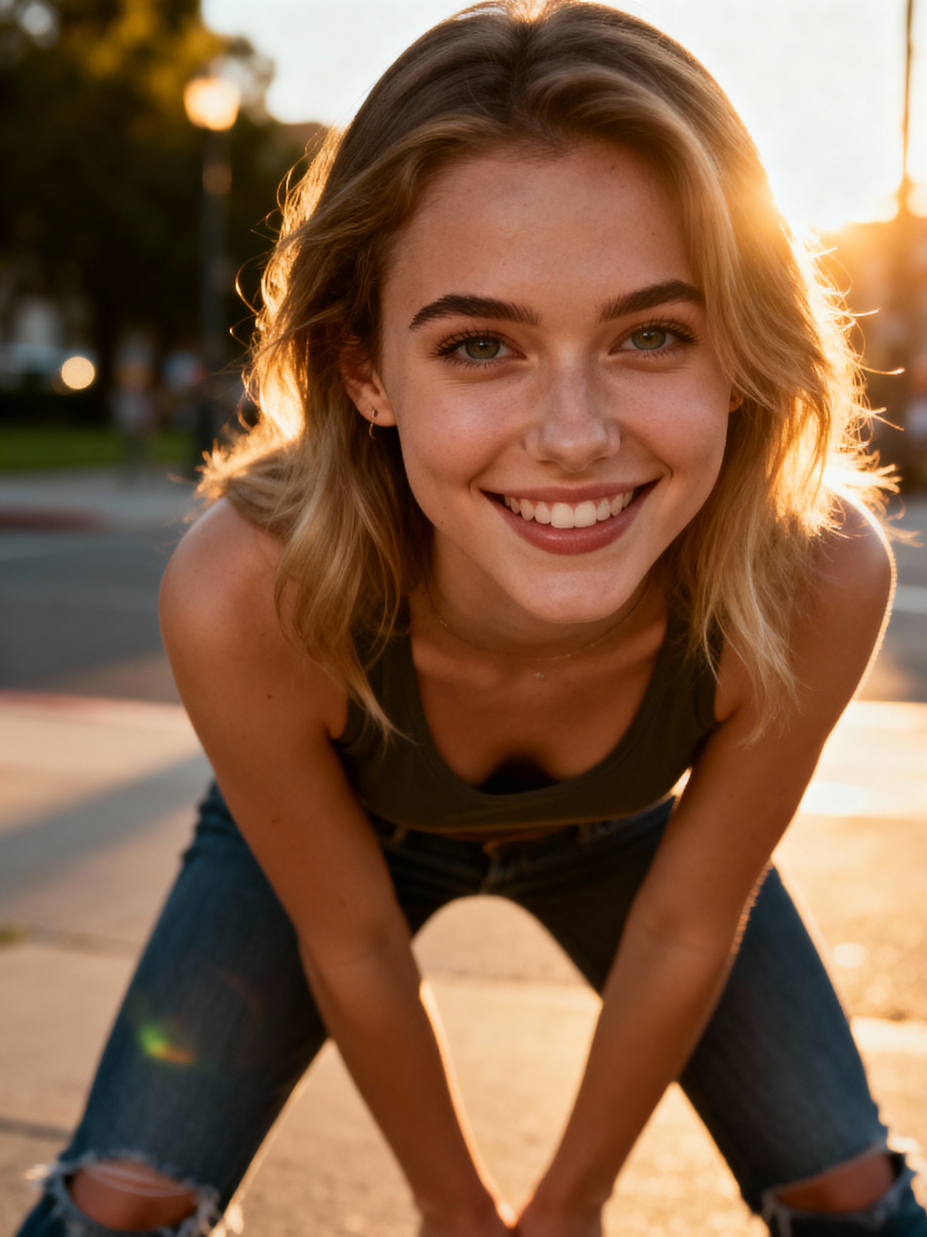 headshot of smiling model wearing casual clothes posing for dating app headshot. outdoor blurry background. the lighting is warm, possibly from a setting sun, creating a soft glow around him, enhancing the casual and relaxed vibe of the image. the setting seems to be outdoors, likely in an urban environment, with the blurred background hinting at a street or park-like area. this image likely portrays a youthful, active, and approachable individual, possibly in a lifestyle or fashion-related context.
