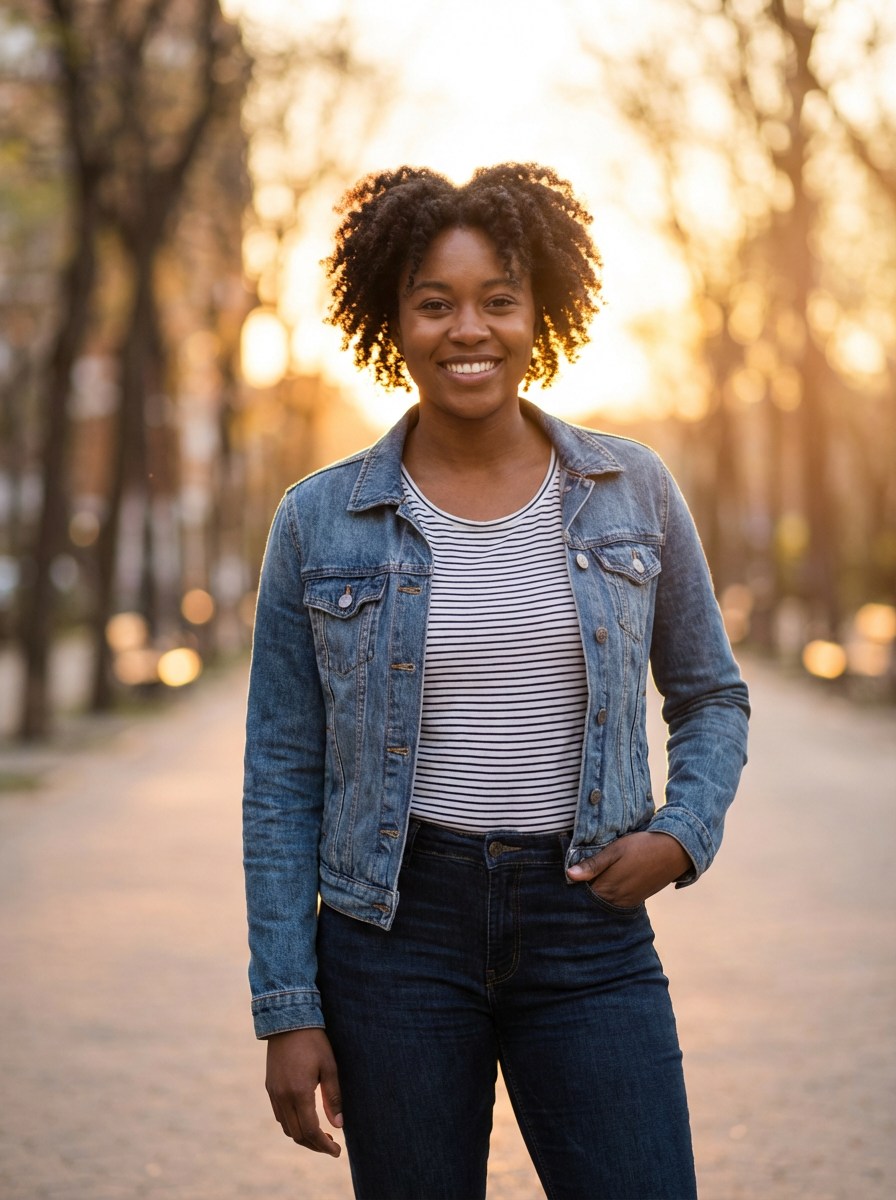 headshot of smiling model wearing casual clothes posing for dating app headshot. outdoor blurry background. the lighting is warm, possibly from a setting sun, creating a soft glow around him, enhancing the casual and relaxed vibe of the image. the setting seems to be outdoors, likely in an urban environment, with the blurred background hinting at a street or park-like area. this image likely portrays a youthful, active, and approachable individual, possibly in a lifestyle or fashion-related context.