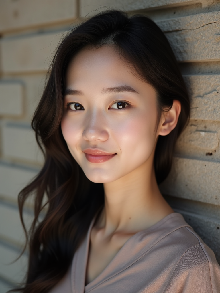 headshot of model, confident gaze, slightly smiling, against a simple textured wall (brick or wood), well-fitted stylish top, natural look