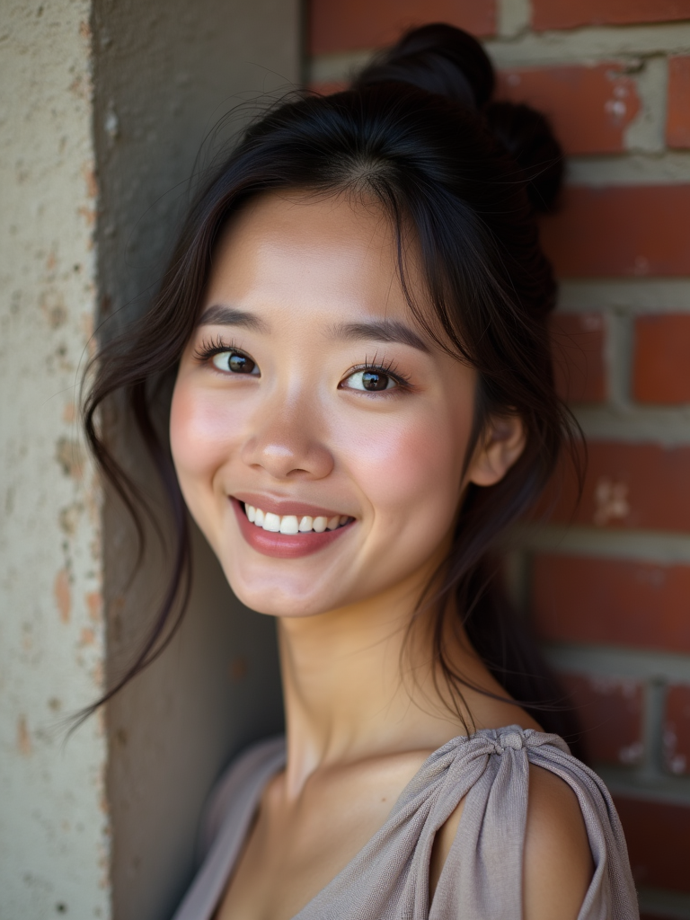 headshot of model, confident gaze, slightly smiling, against a simple textured wall (brick or wood), well-fitted stylish top, natural look