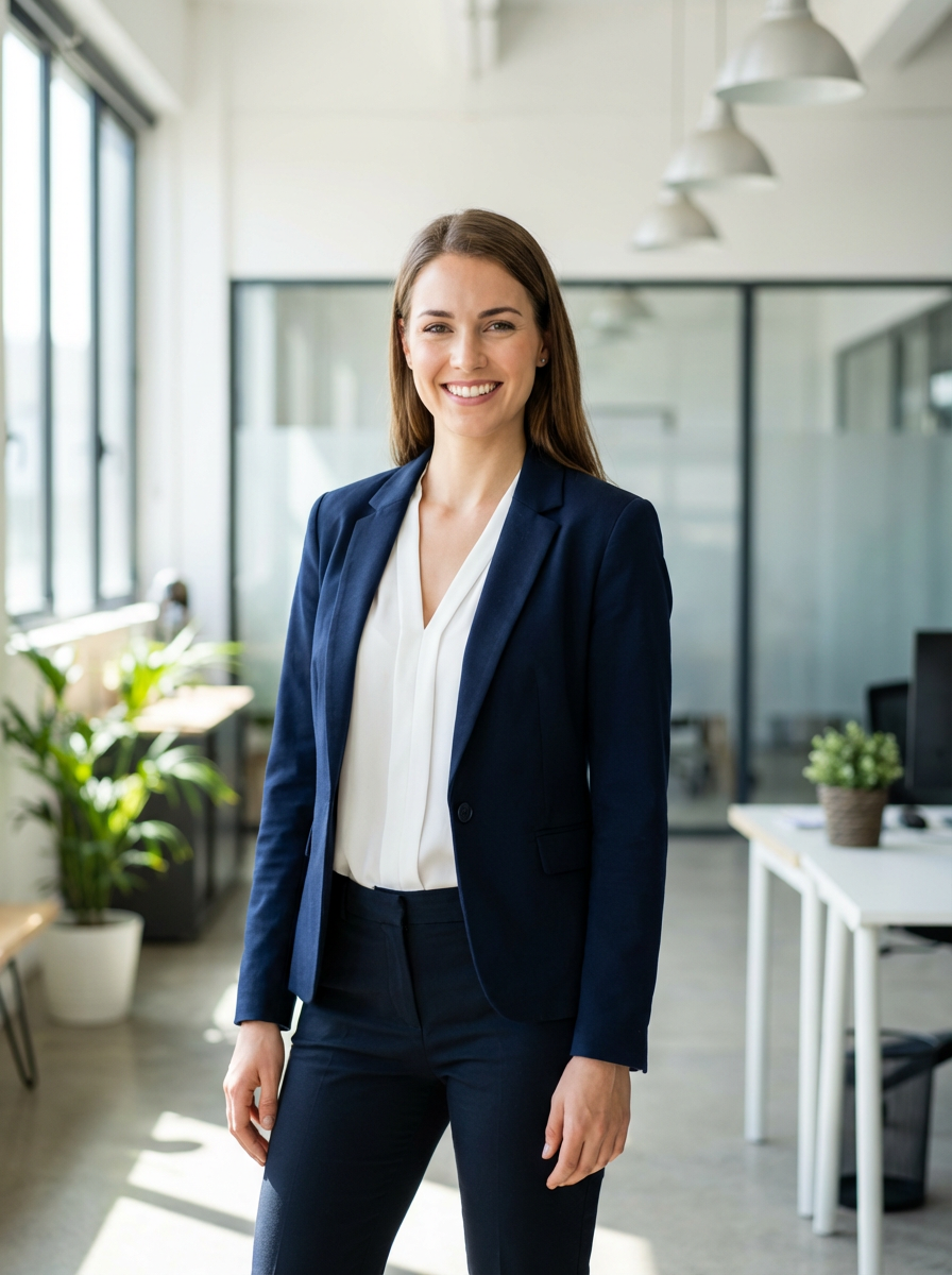 headshot of model, crisp details, executive attire, confident posture, happy expression, high-definition, sharp focus, ambient lighting, business professional, Background features a modern office setting blurred office furniture, and overhead lighting. The atmosphere is bright with natural and artificial light.