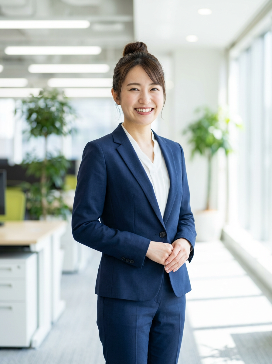 headshot of model, crisp details, executive attire, confident posture, happy expression, high-definition, sharp focus, ambient lighting, business professional, Background features a modern office setting blurred office furniture, and overhead lighting. The atmosphere is bright with natural and artificial light.