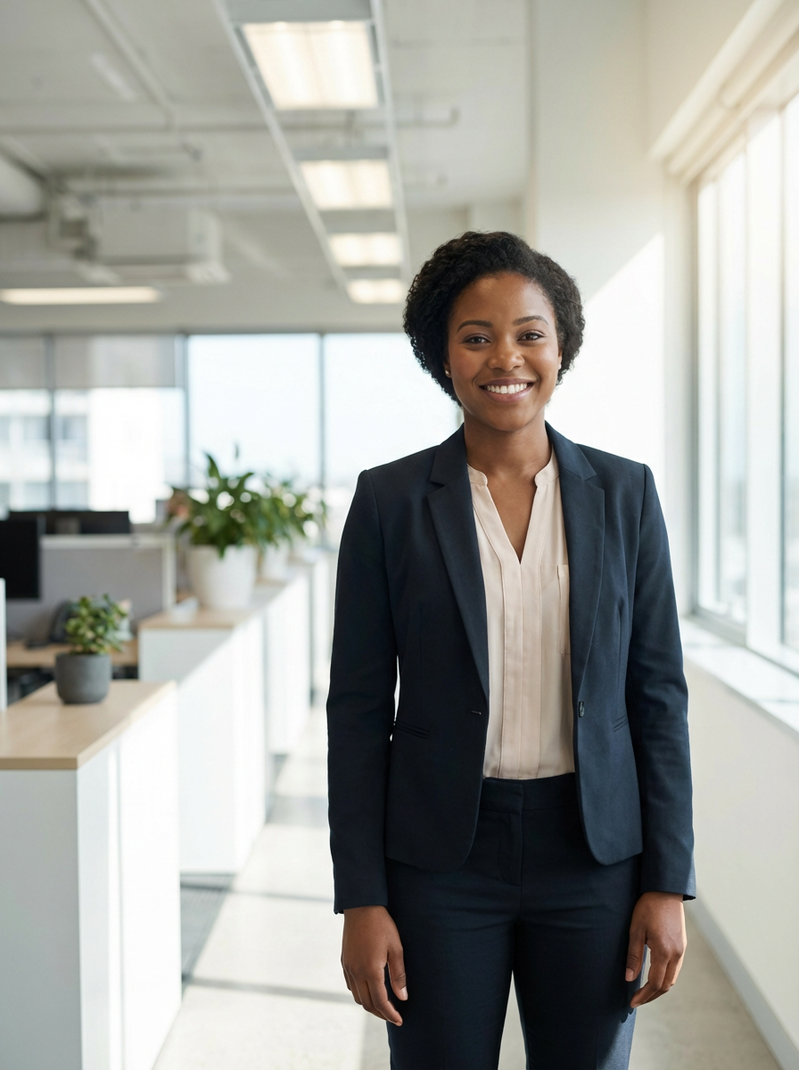 headshot of model, crisp details, executive attire, confident posture, happy expression, high-definition, sharp focus, ambient lighting, business professional, Background features a modern office setting blurred office furniture, and overhead lighting. The atmosphere is bright with natural and artificial light.