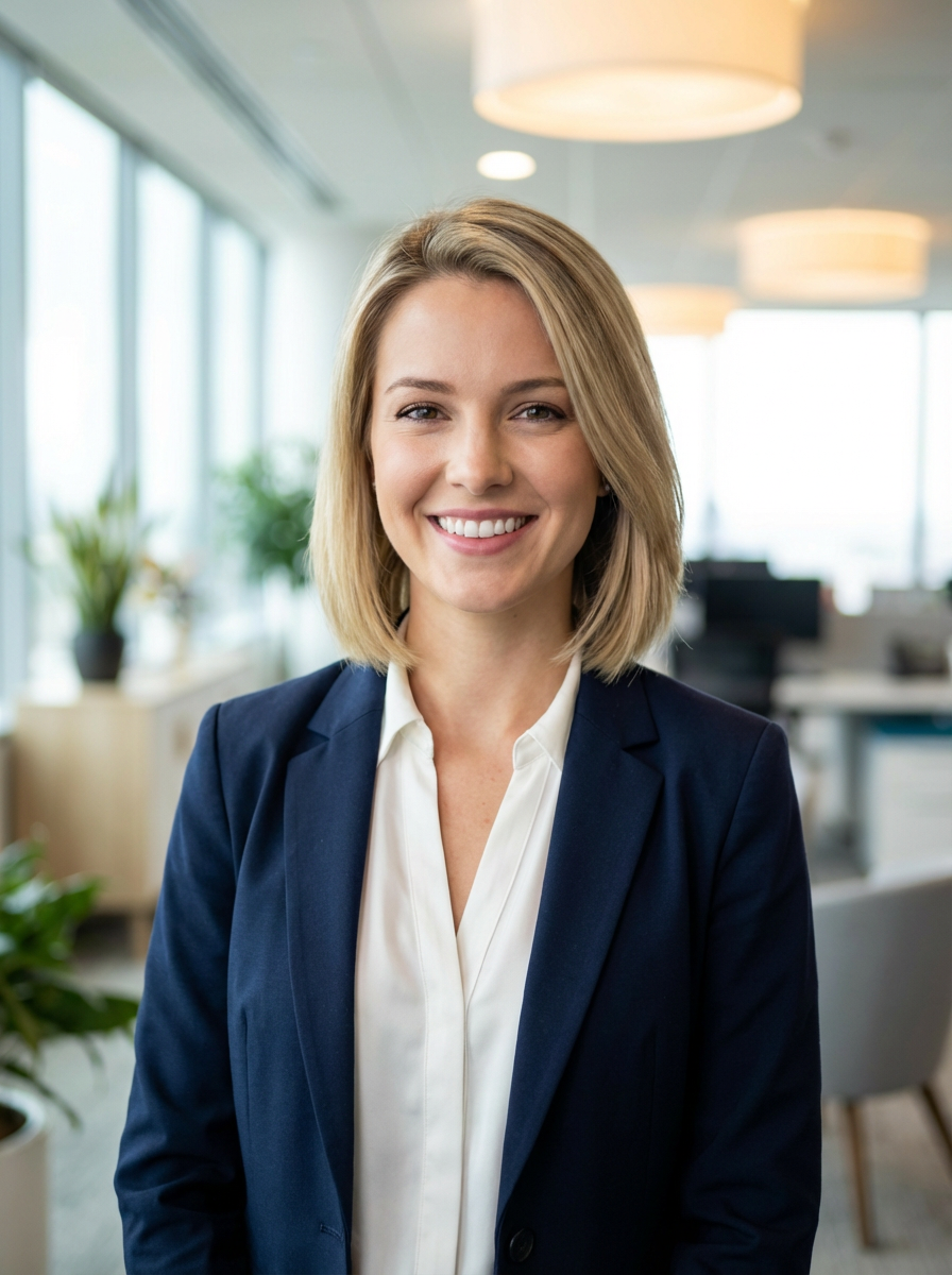 headshot of model, crisp details, executive attire, confident posture, happy expression, high-definition, sharp focus, ambient lighting, business professional, Background features a modern office setting blurred office furniture, and overhead lighting. The atmosphere is bright with natural and artificial light.