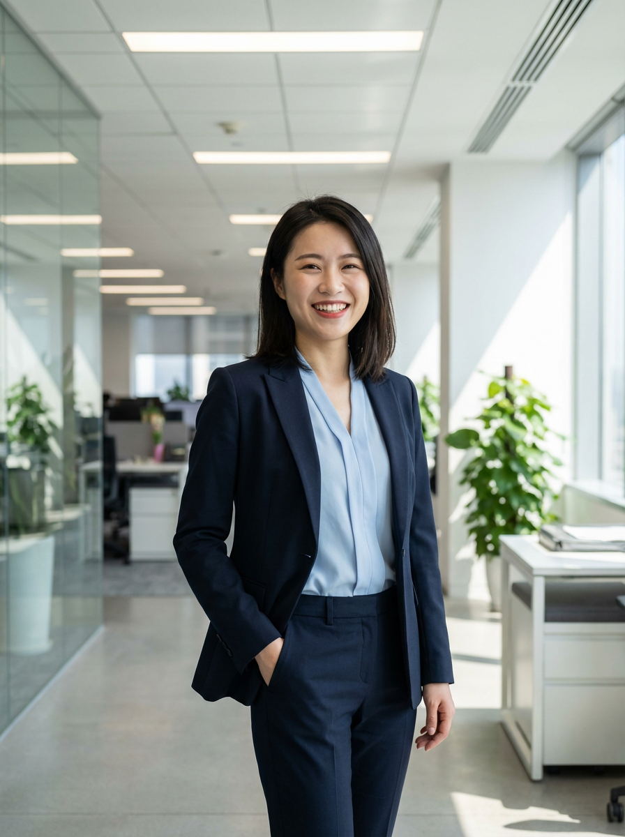 headshot of model, crisp details, executive attire, confident posture, happy expression, high-definition, sharp focus, ambient lighting, business professional, Background features a modern office setting blurred office furniture, and overhead lighting. The atmosphere is bright with natural and artificial light.