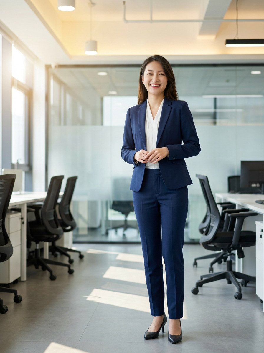 headshot of model, crisp details, executive attire, confident posture, happy expression, high-definition, sharp focus, ambient lighting, business professional, Background features a modern office setting blurred office furniture, and overhead lighting. The atmosphere is bright with natural and artificial light.