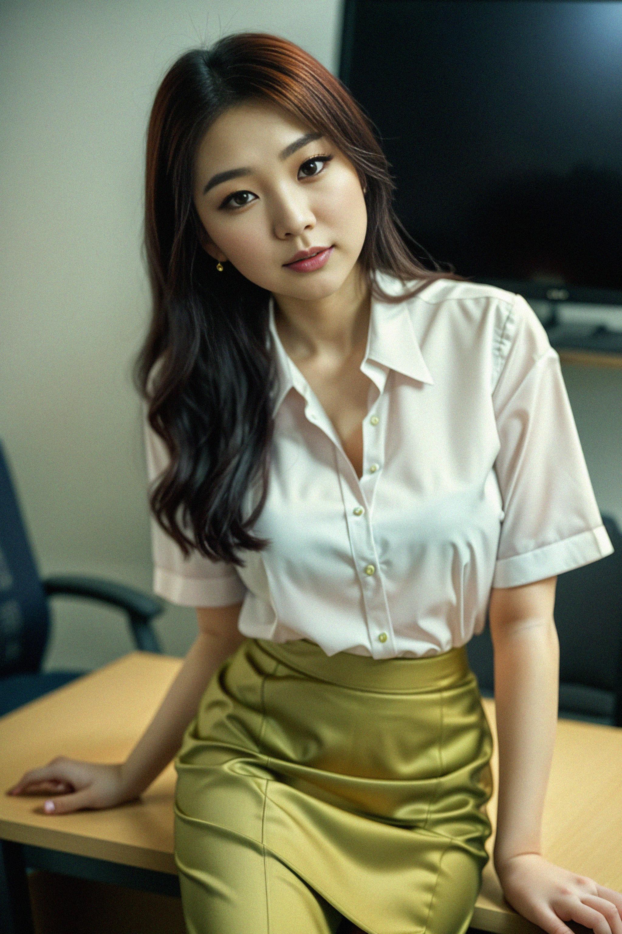 headshot of model, sitting at a desk, at a (office), BREAK elegant blouse, pencil skirt, makeup