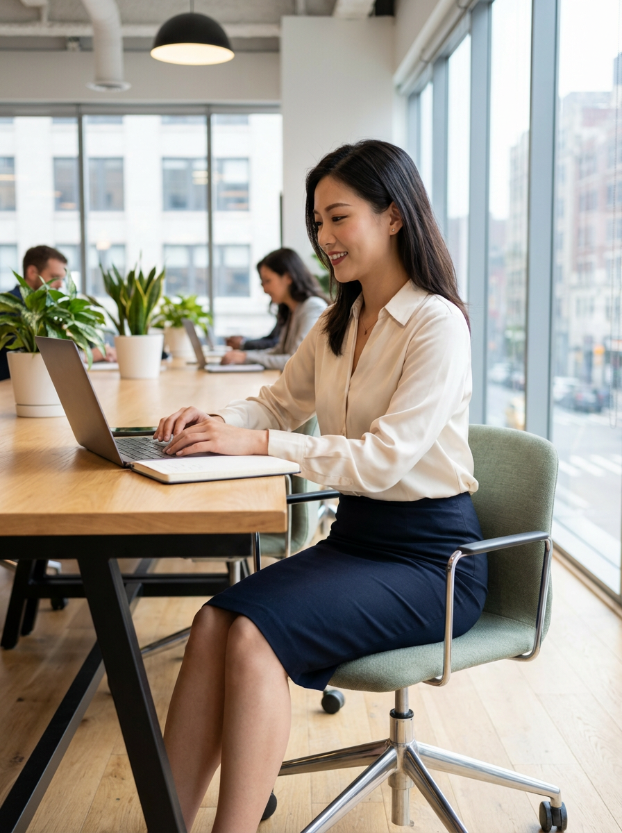 headshot of model, sitting at a desk, at a (office), BREAK elegant blouse, pencil skirt, makeup