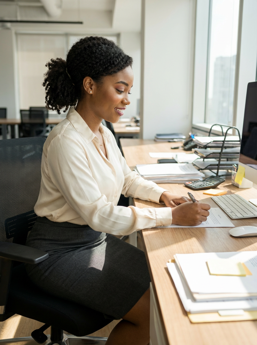 headshot of model, sitting at a desk, at a (office), BREAK elegant blouse, pencil skirt, makeup