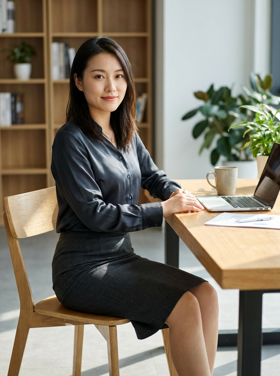 headshot of model, sitting at a desk, at a (office), BREAK elegant blouse, pencil skirt, makeup