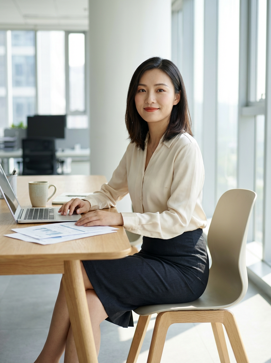 headshot of model, sitting at a desk, at a (office), BREAK elegant blouse, pencil skirt, makeup
