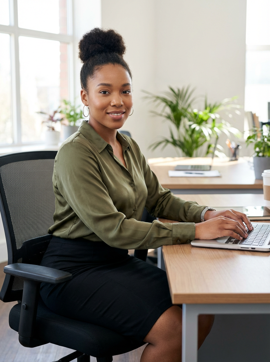 headshot of model, sitting at a desk, at a (office), BREAK elegant blouse, pencil skirt, makeup