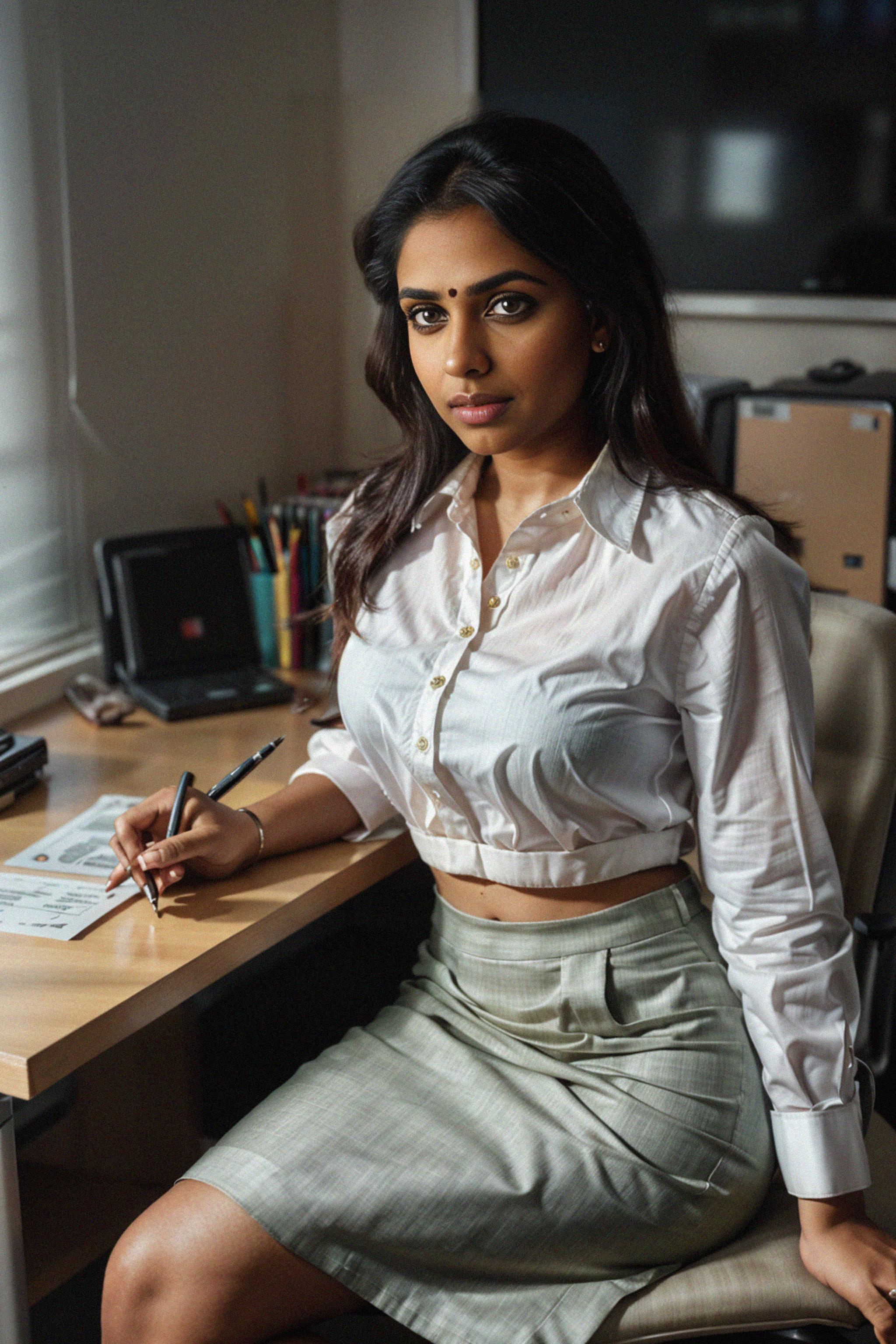 headshot of model, sitting at a desk, at a (office), BREAK elegant blouse, pencil skirt, makeup