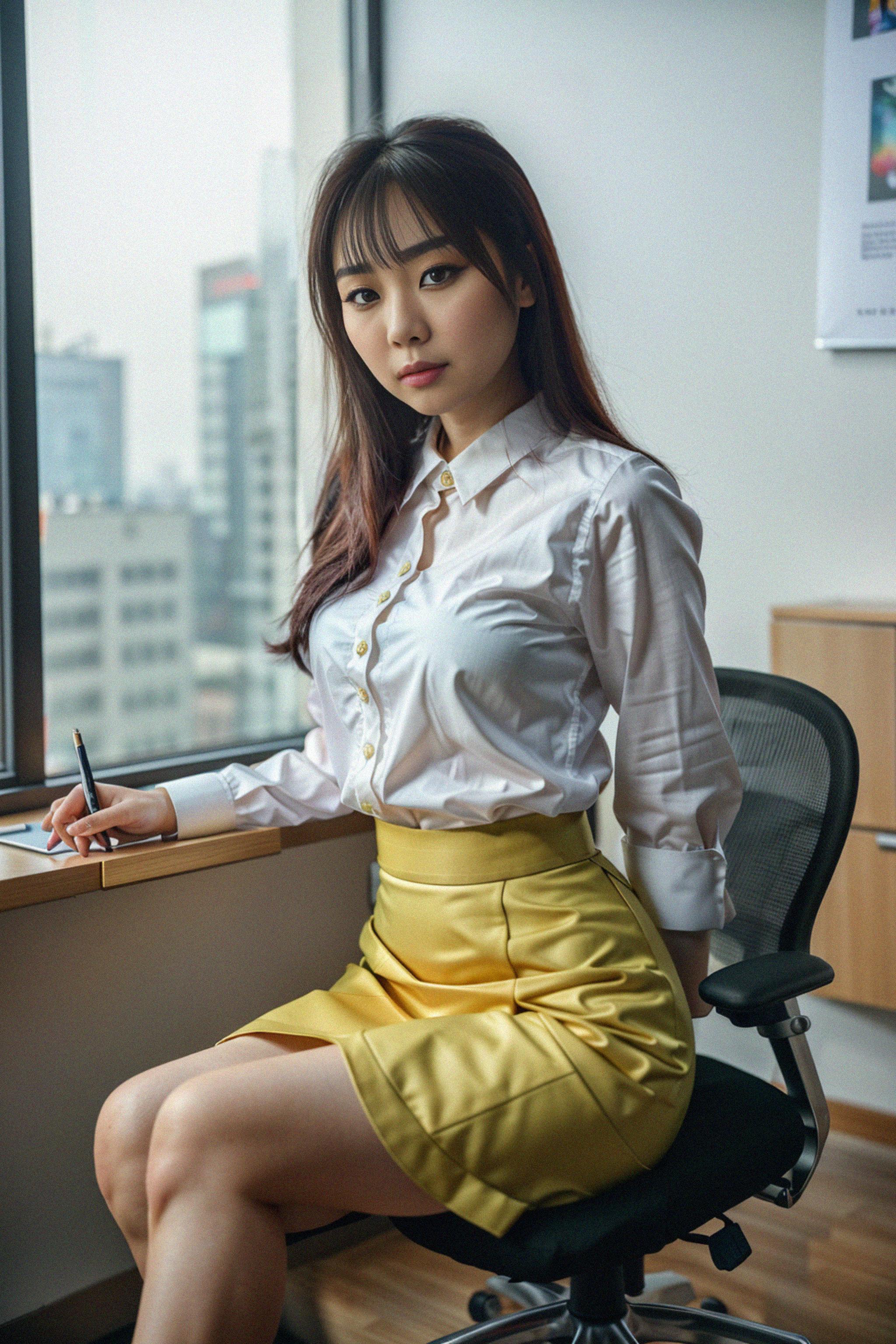 headshot of model, sitting at a desk, at a (office), BREAK elegant blouse, pencil skirt, makeup