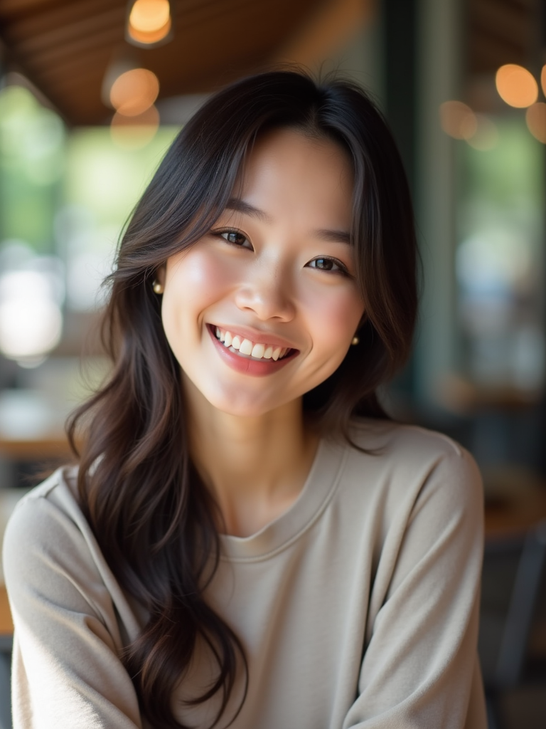 headshot of model, smiling warmly, natural light, blurred background (cafe or park), casual clothing, approachable expression