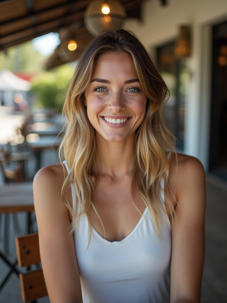 headshot of model, smiling warmly, natural light, blurred background (cafe or park), casual clothing, approachable expression