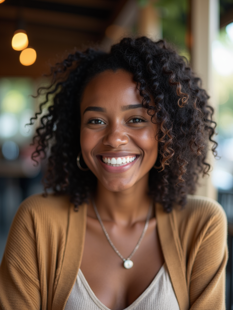 headshot of model, smiling warmly, natural light, blurred background (cafe or park), casual clothing, approachable expression