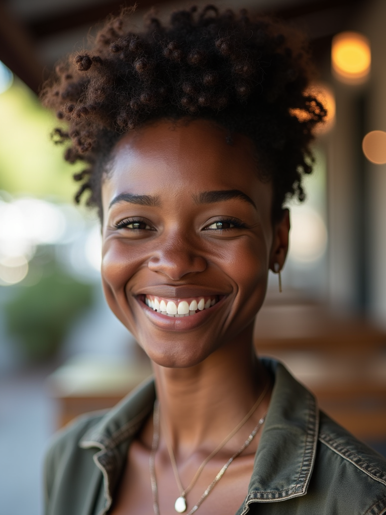 headshot of model, smiling warmly, natural light, blurred background (cafe or park), casual clothing, approachable expression