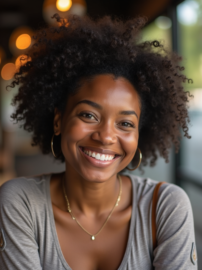 headshot of model, smiling warmly, natural light, blurred background (cafe or park), casual clothing, approachable expression