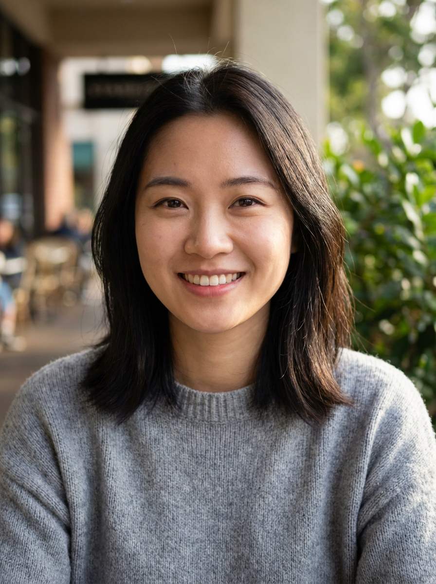 headshot of model, smiling warmly, natural light, blurred background (cafe or park), casual clothing, approachable expression