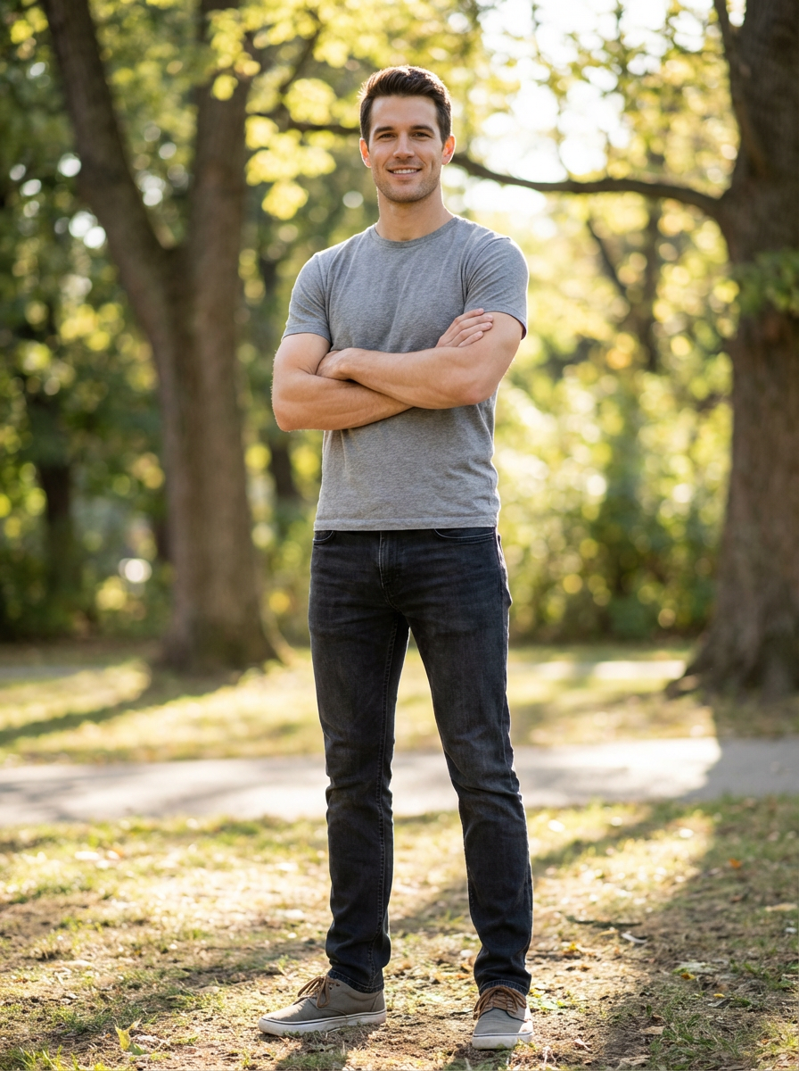 healthy glowing model, defined jawline, fit appearance, natural lighting, casual outfit