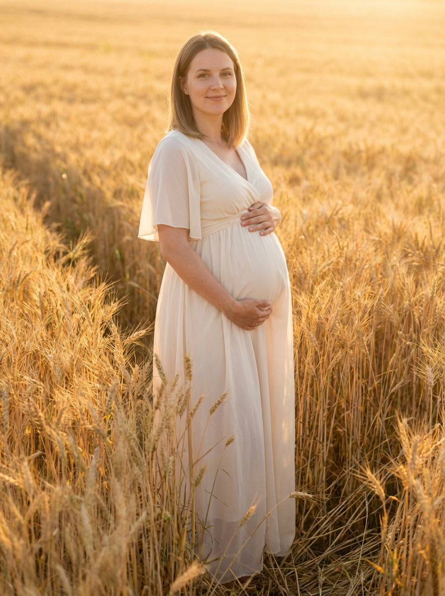 healthy pregnant model in maternity photographs, beautiful pregnant model, maternity photography in field of wheat. golden hour