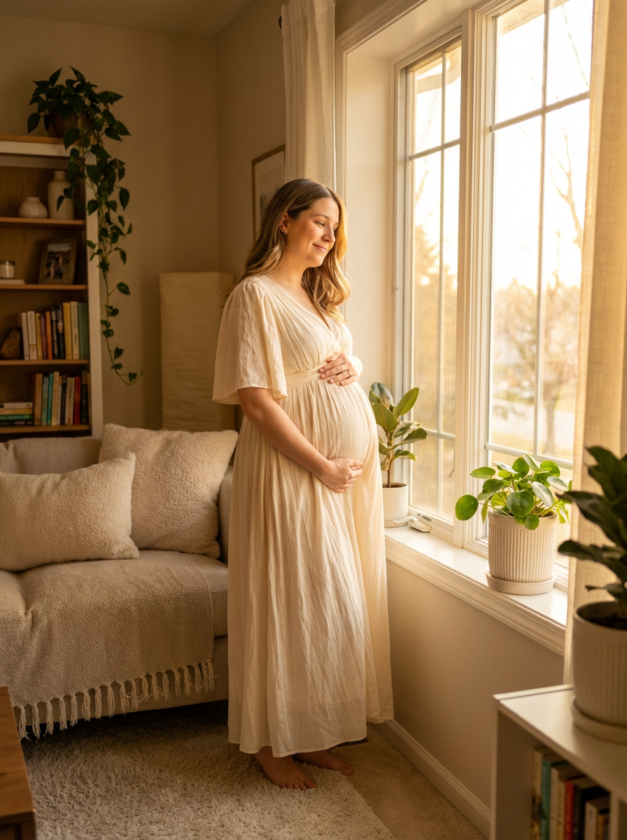 healthy pregnant model in maternity photographs, beautiful pregnant model, maternity photography in beautiful home. golden hour