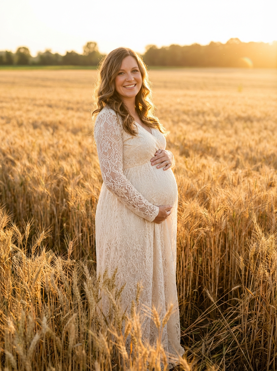 healthy pregnant model in maternity photographs, beautiful pregnant model, maternity photography in field of wheat. golden hour