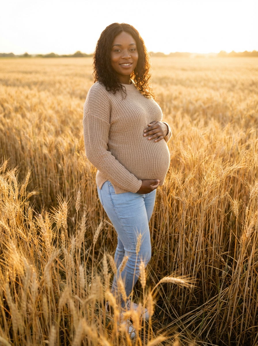healthy pregnant model in maternity photographs, beautiful pregnant model, maternity photography in field of wheat. golden hour