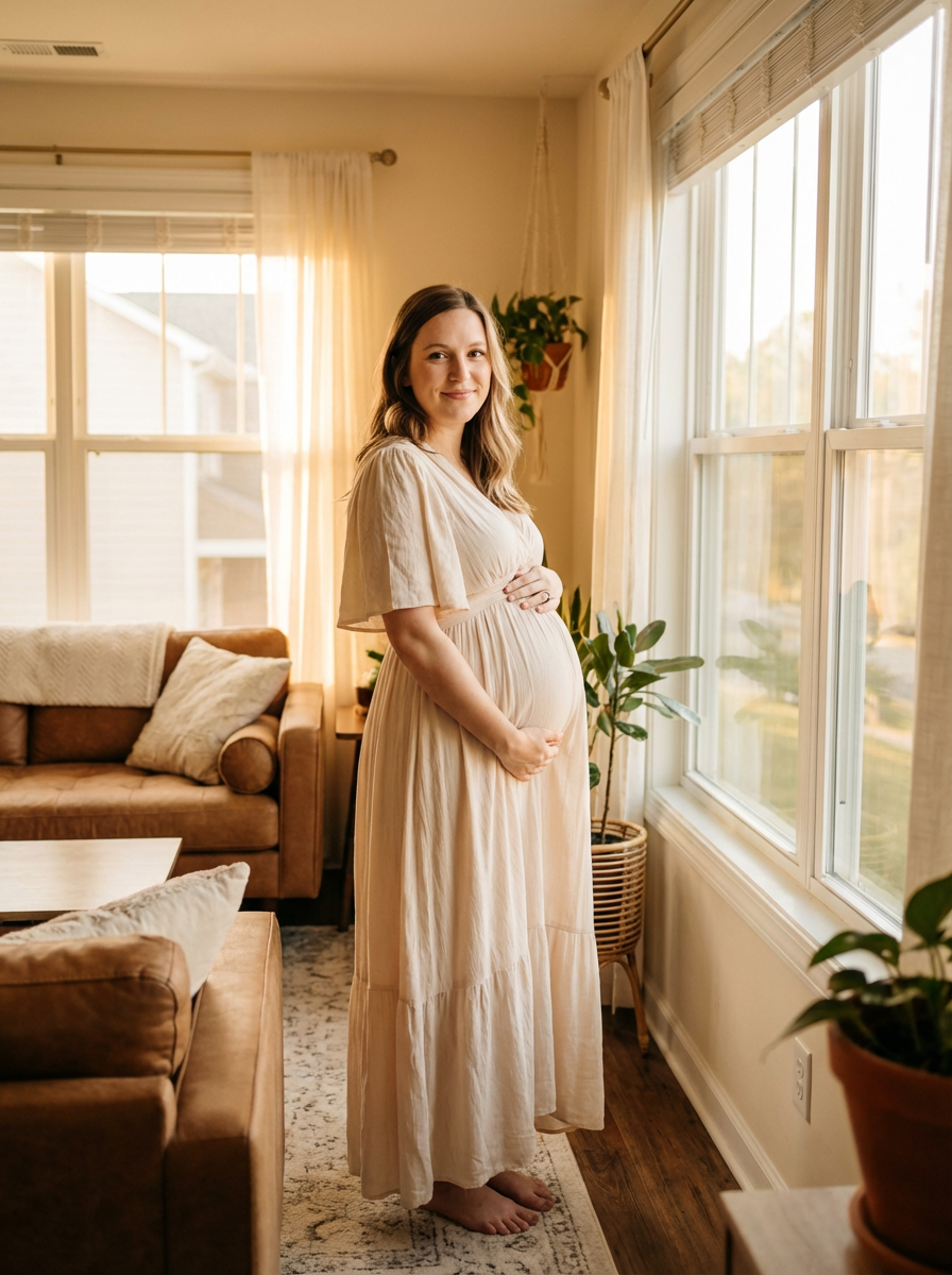 healthy pregnant model in maternity photographs, beautiful pregnant model, maternity photography in beautiful home. golden hour