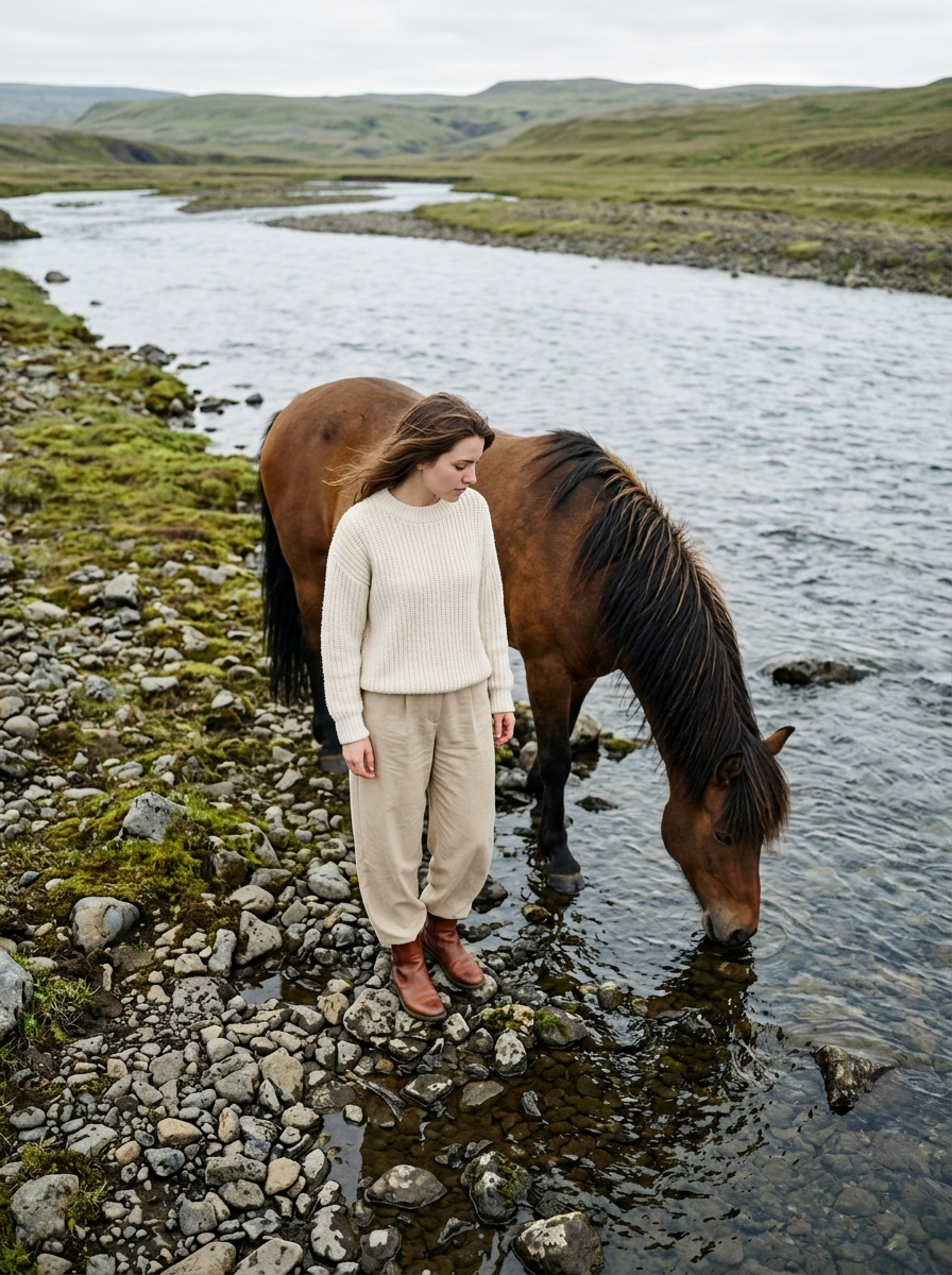 High angle shot looking down at the male model and brown horse from above, the full scene composition near the Icelandic river. The model stands relaxed in baggy cream trousers, white sweater, and brown leather boots, positioned thoughtfully relative to the horse drinking water. The riverbank, stones, and moss create a natural pattern beneath them. Clean, minimalistic fashion editorial framing with balanced negative space, air-brushed soft rendering, muted contrast, natural skin texture preserved, slightly enhanced green tones in landscape, soft natural overcast light. Hasselblad 85mm overhead perspective, vertical 9:16, Jil Sander serene outdoor aesthetic.
