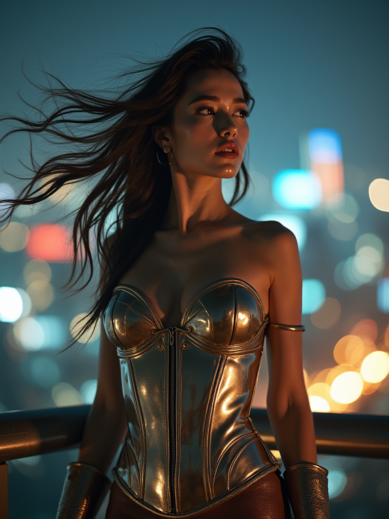 High-energy rooftop scene of model in a metallic glossy superhero corset and heels, posing with fierce confidence under a dramatic spotlight. Her bold pose and wind-swept hair create a powerful, commanding presence. The surrounding night sky and blurred city lights enhance the superhero fantasy aesthetic.