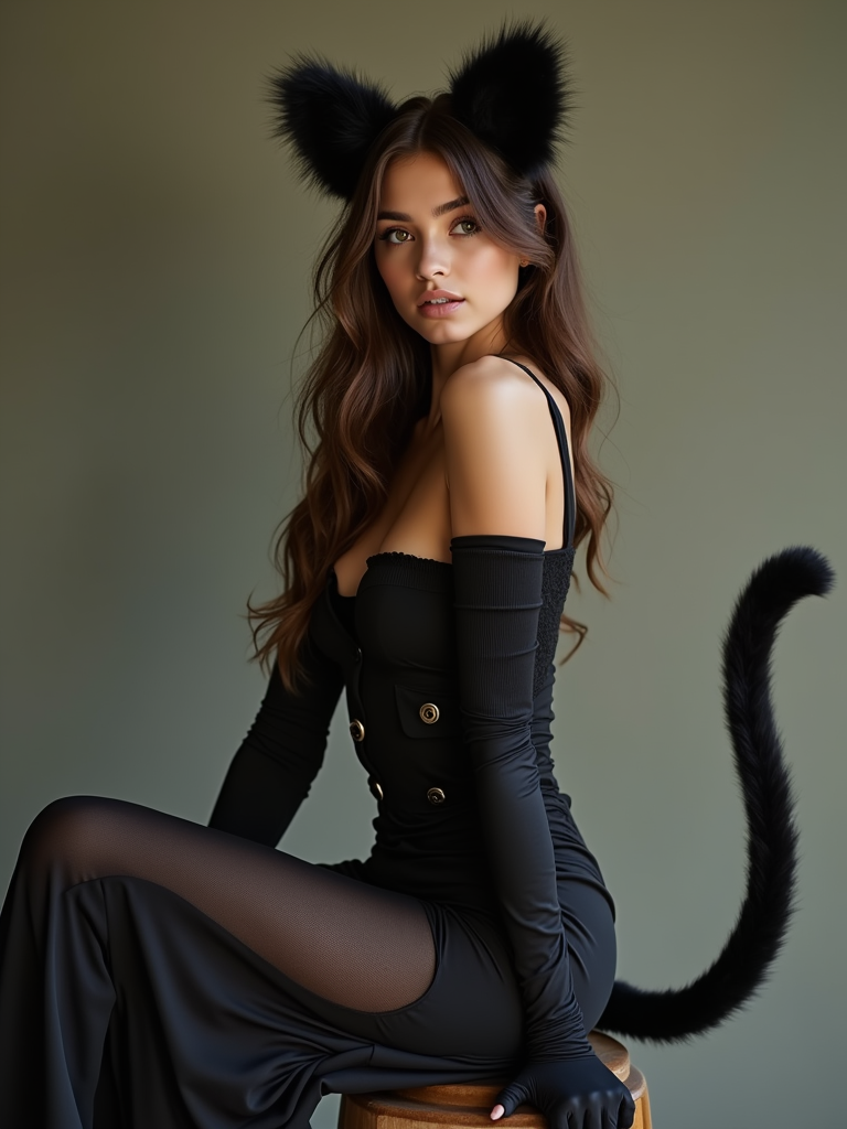 High-fashion Catgirl model editorial shoot. Elegant cat ears, stylish outfit with subtle cat motifs, graceful pose . Artistic portrait.