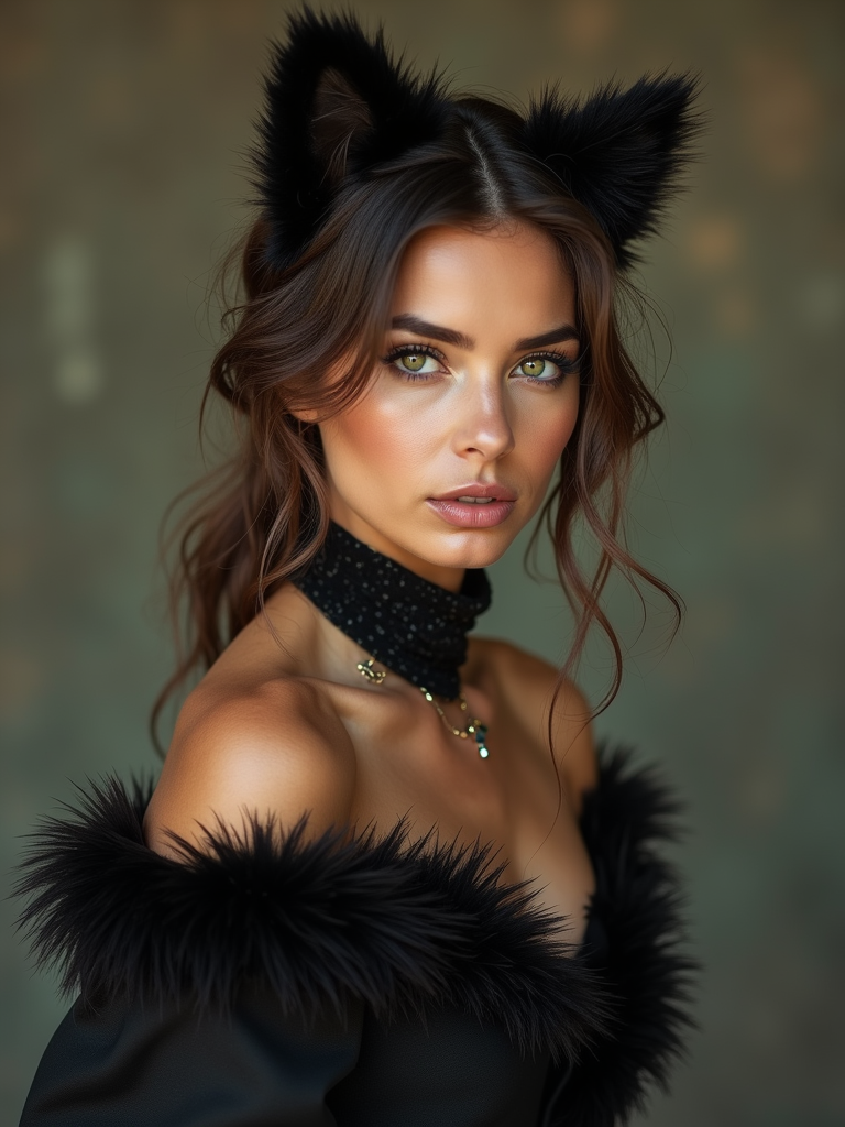 High-fashion Catgirl model editorial shoot. Elegant cat ears, stylish outfit with subtle cat motifs, graceful pose . Artistic portrait.