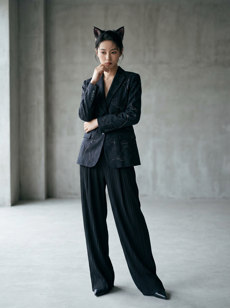 High-fashion Catgirl model editorial shoot. Elegant cat ears, stylish outfit with subtle cat motifs, graceful pose . Artistic portrait.