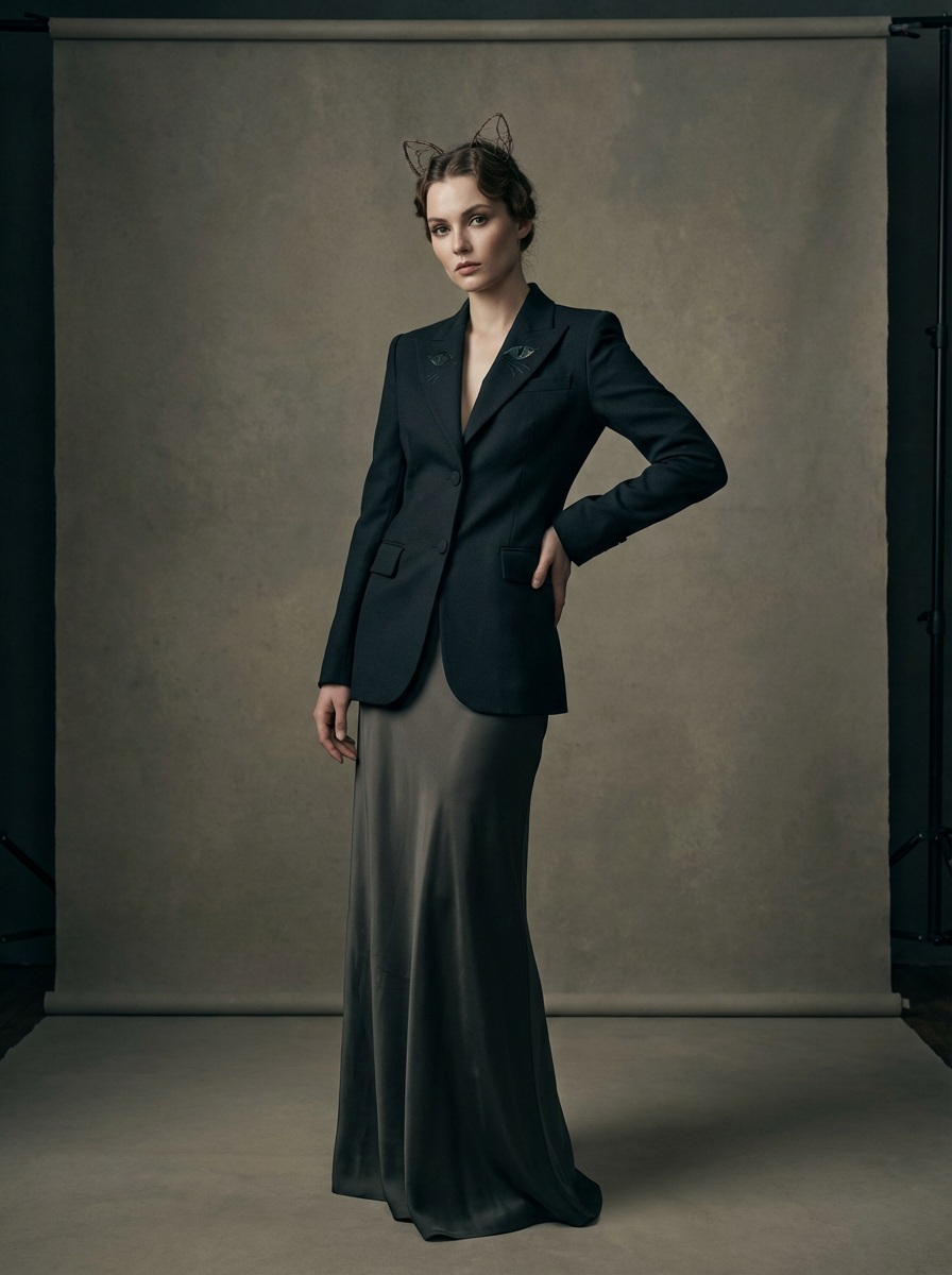 High-fashion Catgirl model editorial shoot. Elegant cat ears, stylish outfit with subtle cat motifs, graceful pose . Artistic portrait.