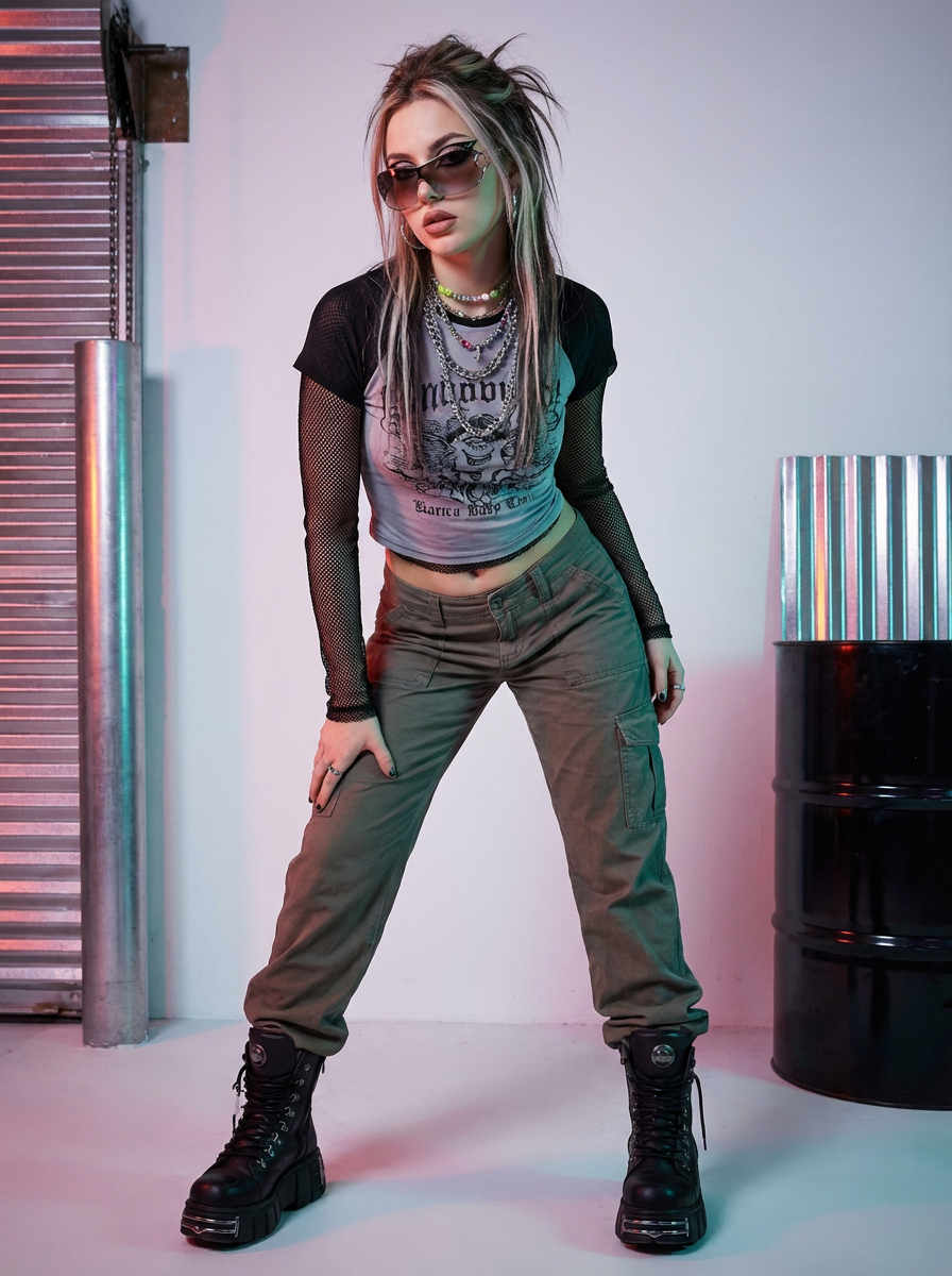 High-fashion E-Girl model editorial shoot. Dressed in Y2K aesthetic, platform shoes, bold accessories . AI fashion-forward portrait.