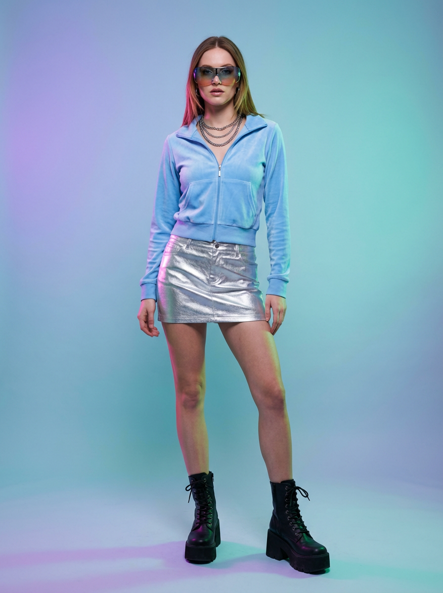 High-fashion E-Girl model editorial shoot. Dressed in Y2K aesthetic, platform shoes, bold accessories . AI fashion-forward portrait.