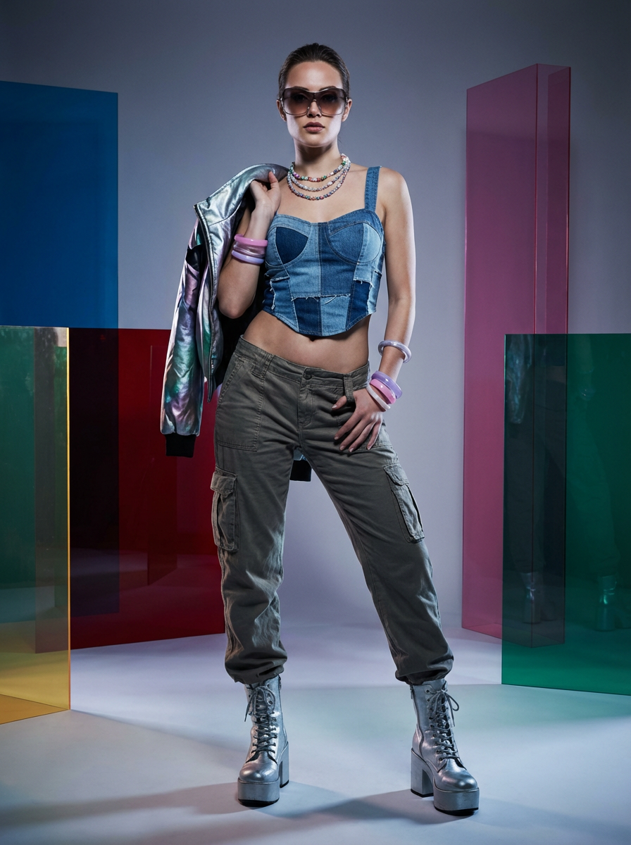 High-fashion E-Girl model editorial shoot. Dressed in Y2K aesthetic, platform shoes, bold accessories . AI fashion-forward portrait.