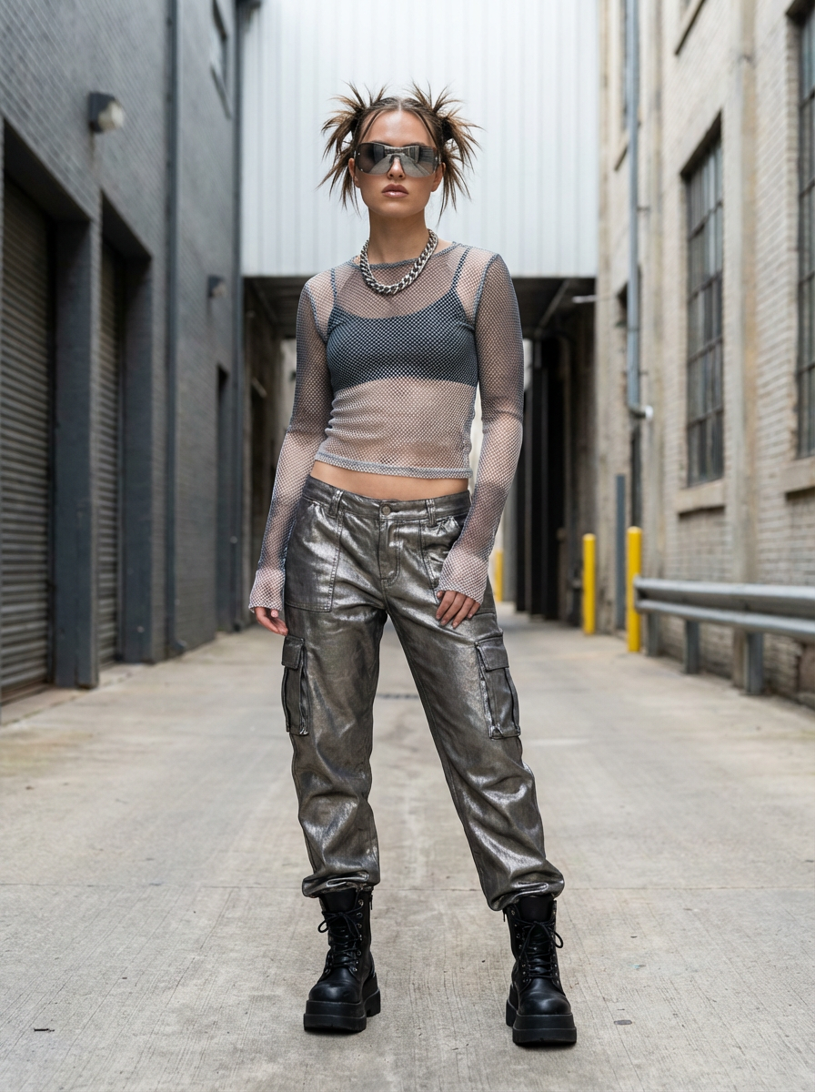 High-fashion E-Girl model editorial shoot. Dressed in Y2K aesthetic, platform shoes, bold accessories . AI fashion-forward portrait.