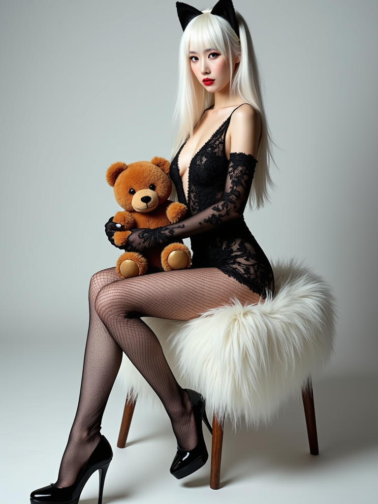 High-key studio photo of a seductive female model with long white hair, cat ears, styled in a glossy black lace bodysuit and bold fishnet stockings. She sits elegantly on a plush white faux fur stool, holding a teddy bear. Her pose is confident and teasing, with high heels and subtle gothic accents.