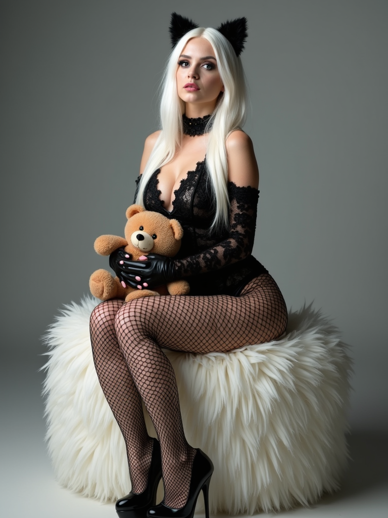 High-key studio photo of a seductive female model with long white hair, cat ears, styled in a glossy black lace bodysuit and bold fishnet stockings. She sits elegantly on a plush white faux fur stool, holding a teddy bear. Her pose is confident and teasing, with high heels and subtle gothic accents.