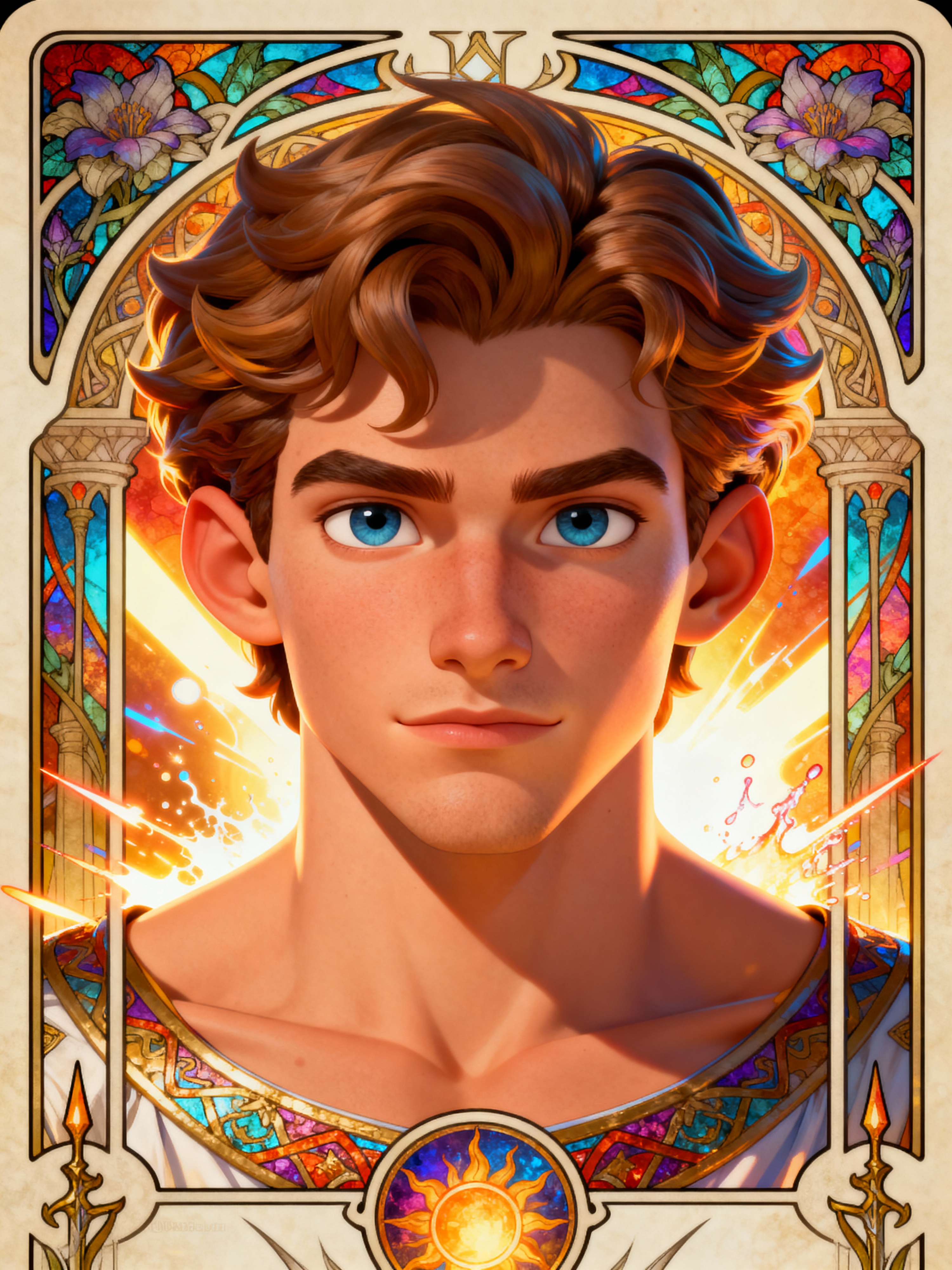 illustration of model as Mythical Tarot Cardin the style of moebius and mohrbacher and rossdraws and ross tran and alphonse mucha and ayami kojima, pixar style, maya engine, splash comics style, tarot card style, art nouveau, rich bright colours