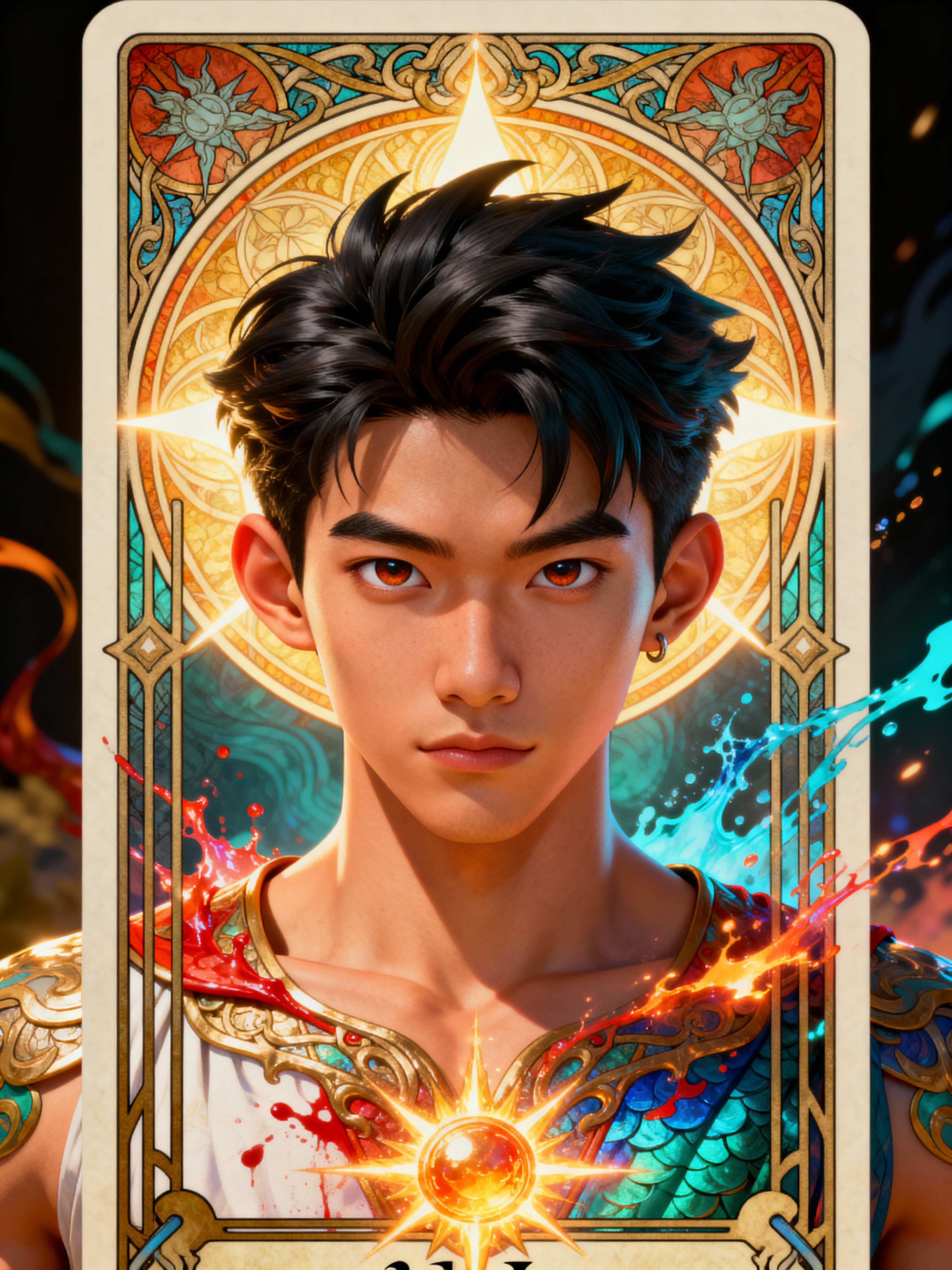illustration of model as Mythical Tarot Cardin the style of moebius and mohrbacher and rossdraws and ross tran and alphonse mucha and ayami kojima, pixar style, maya engine, splash comics style, tarot card style, art nouveau, rich bright colours