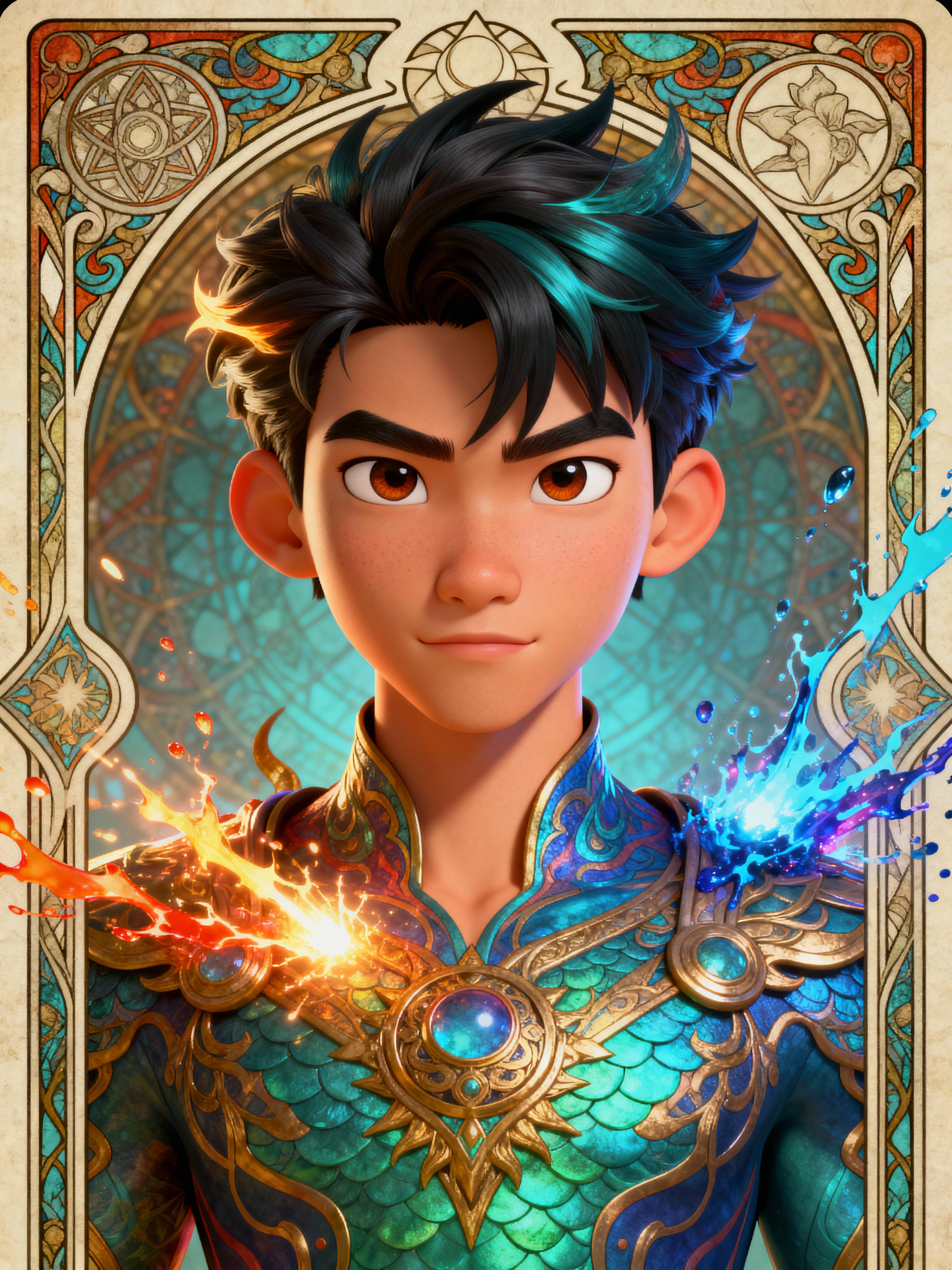 illustration of model as Mythical Tarot Cardin the style of moebius and mohrbacher and rossdraws and ross tran and alphonse mucha and ayami kojima, pixar style, maya engine, splash comics style, tarot card style, art nouveau, rich bright colours